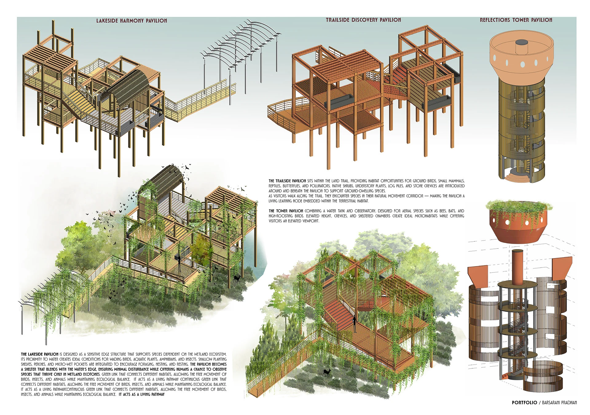 Architecture for the Living World explores landscape and architecture as inclusive systems designed not only for human use, but for the broader web of life. The portfolio investigates how built form can operate as an extension of ecological processes—supporting habitats, enabling species movement, and fostering coexistence between human and non-human communities.