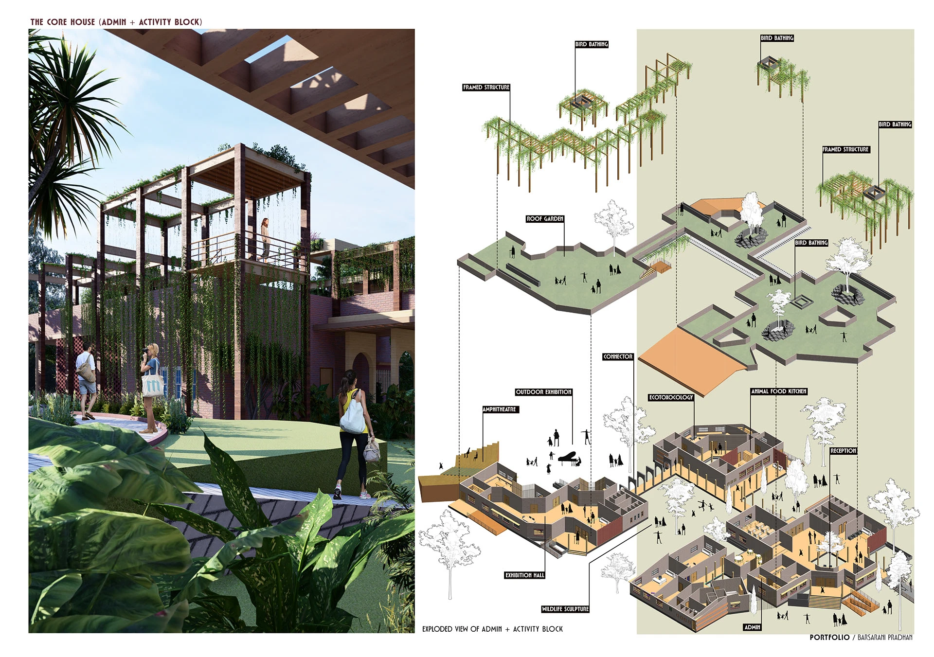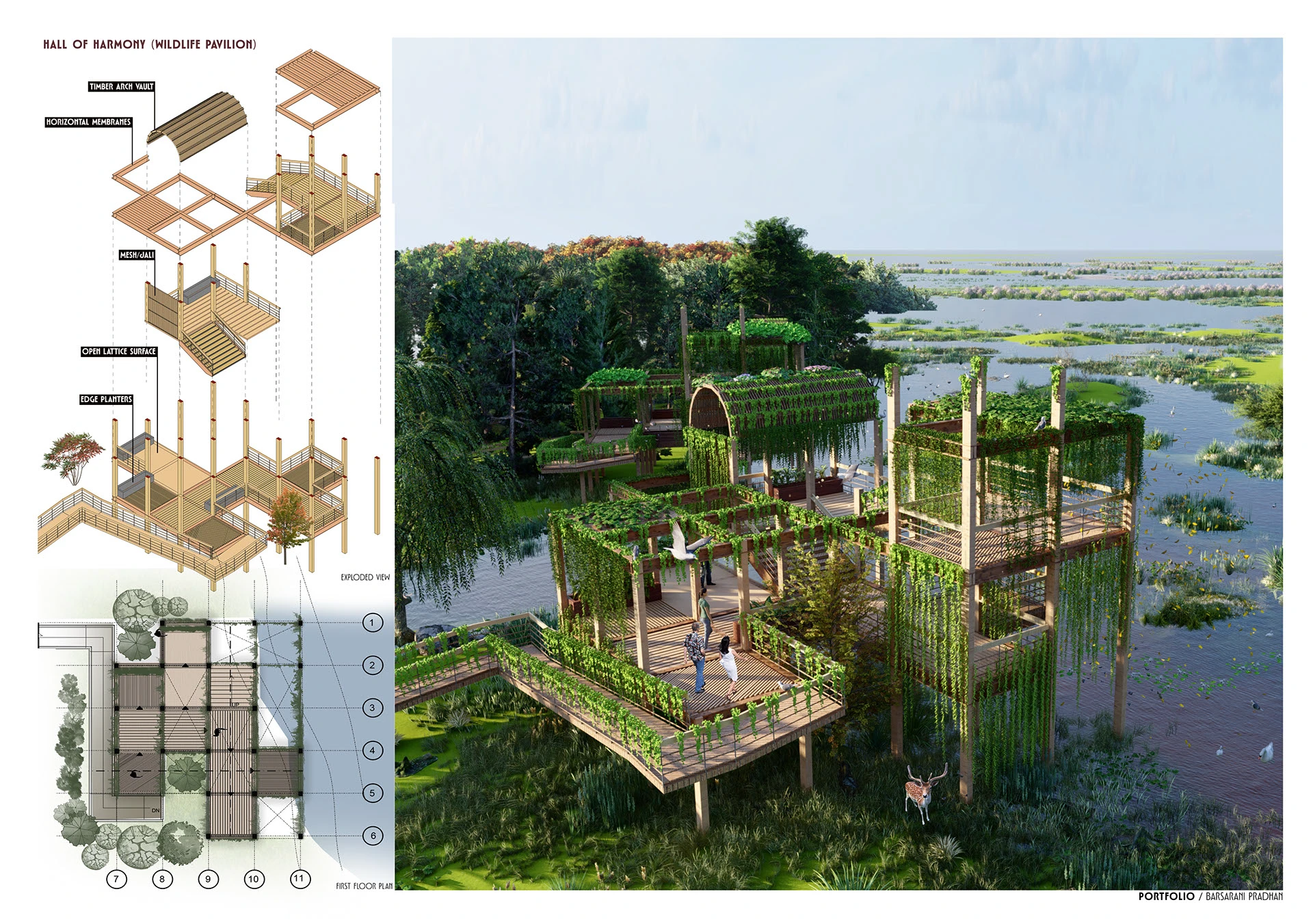 Design decisions are guided by an understanding of the site as a living system shaped by movement, growth, and interdependence. Human circulation is choreographed alongside wildlife corridors; buildings become frameworks for vegetation, nesting, and shelter; and open spaces operate as shared territories that encourage awareness, immersion, and stewardship.