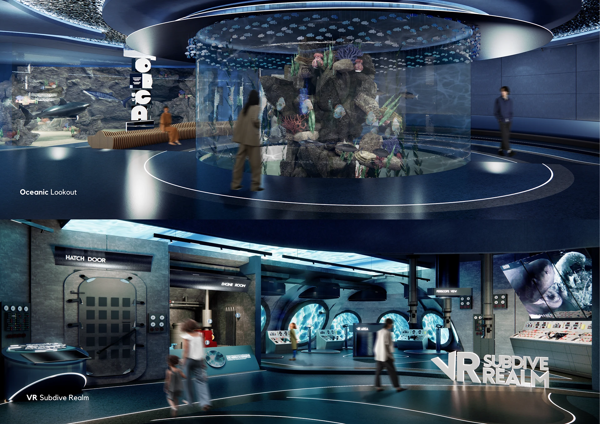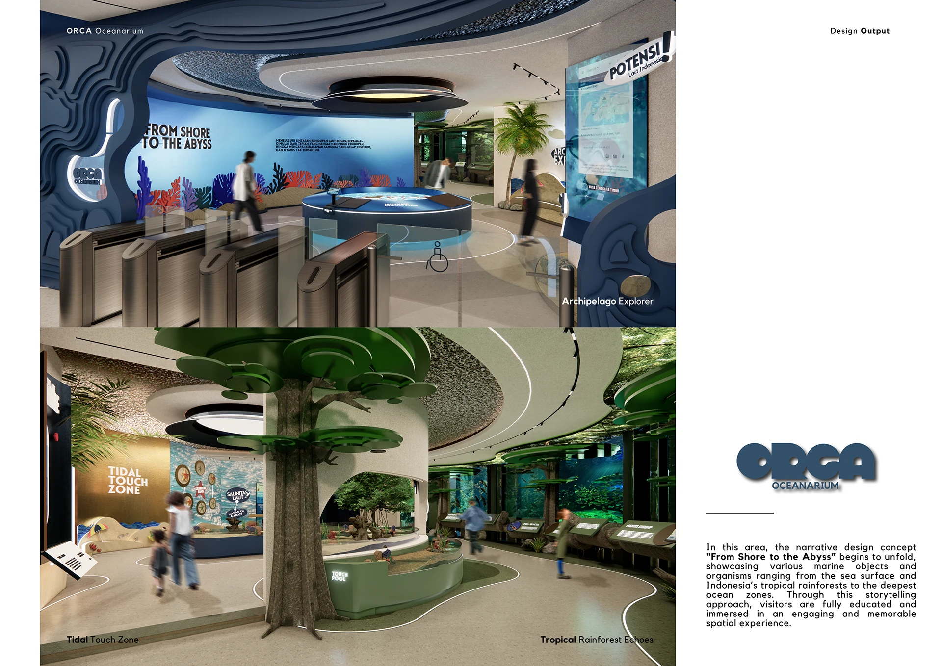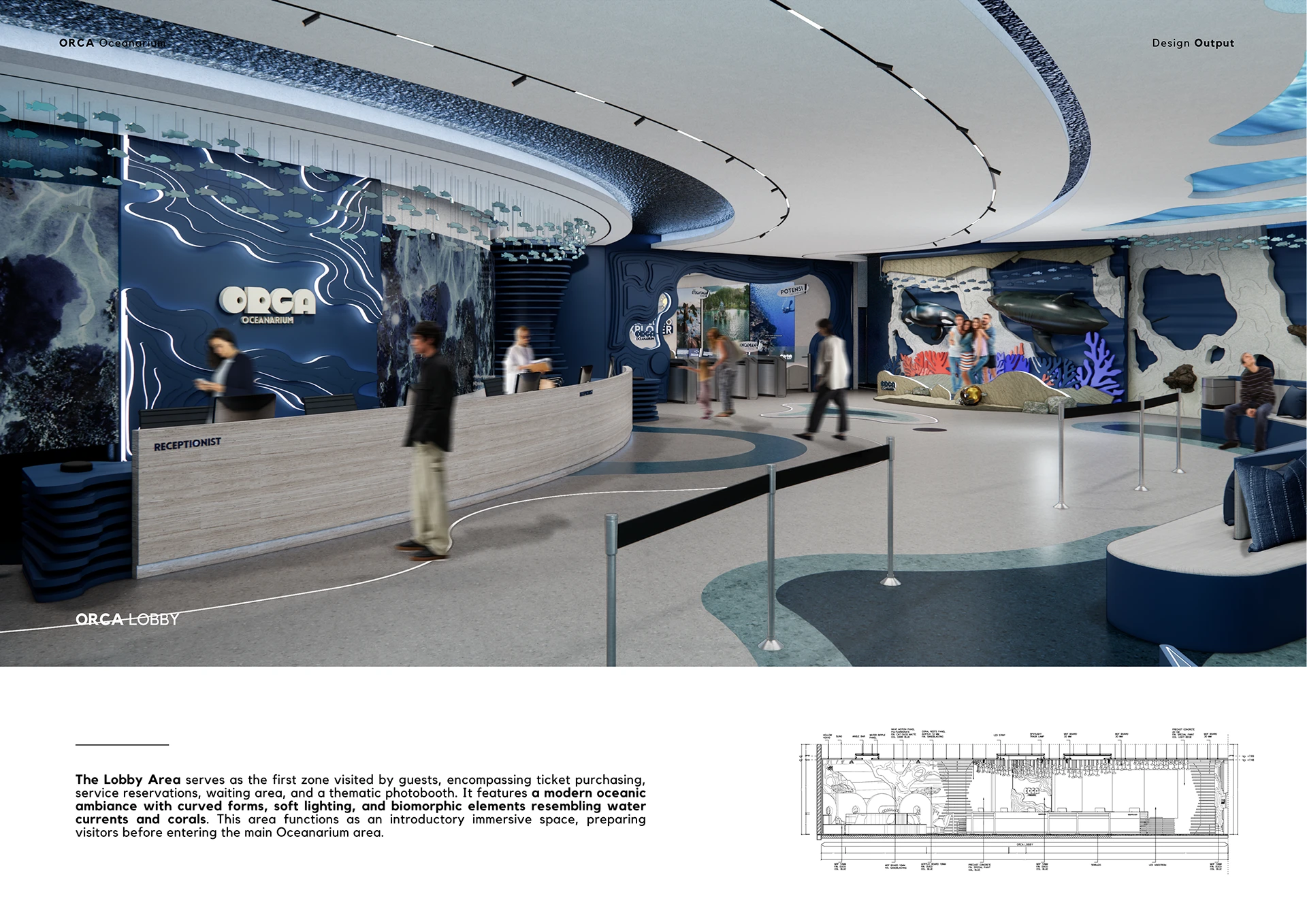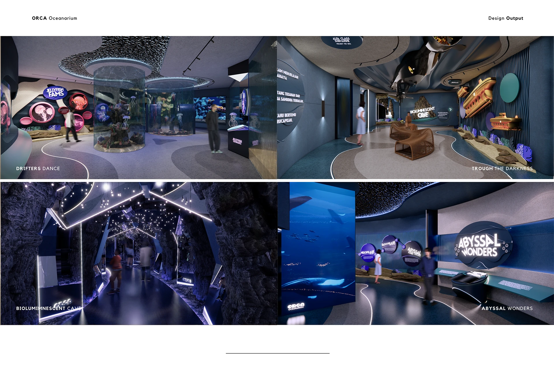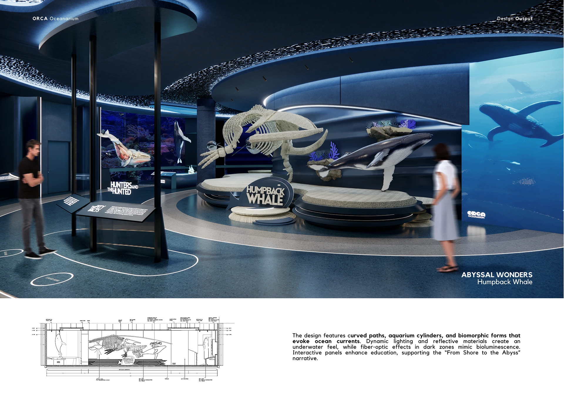 “ORCA: The Immersive Abyss” is a spatial exploration that translates the vertical journey of the ocean into a horizontal interior experience. The design moves away from traditional, static museum displays and instead places the visitor inside a “living” narrative.